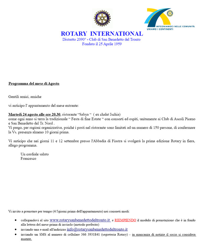 ROTARY CLUB SAN BENEDETTO DEL TRONTO : Sede presso HOTEL CALABRESI - Lungomare C.Colombo - Tel. 328/4682752