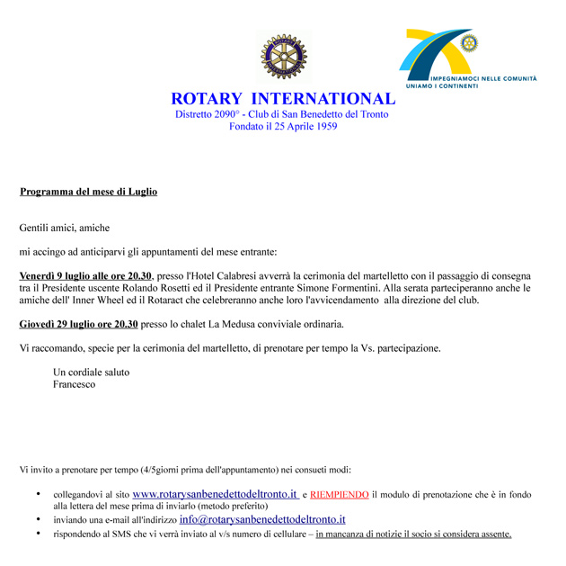 ROTARY CLUB SAN BENEDETTO DEL TRONTO : Sede presso HOTEL CALABRESI - Lungomare C.Colombo - Tel. 328/4682752